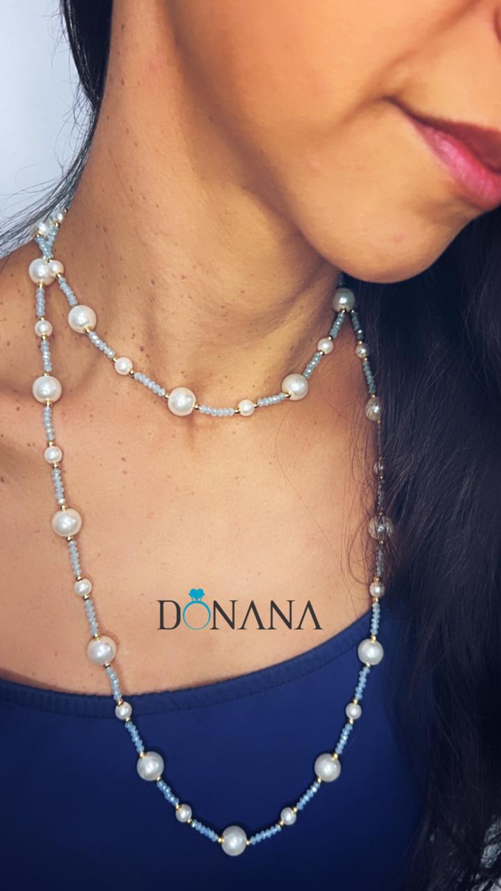 Colar Pérolas e Miçangas Azuis Brilhantes e Mini Esferas Douradas 2 Voltas