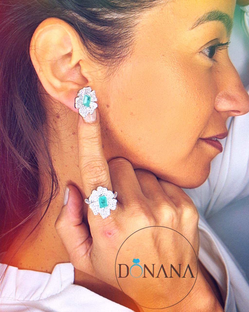 Conjunto anel (19) e Brincos com Pedra Verde Gravejados com Cristais. Ródio